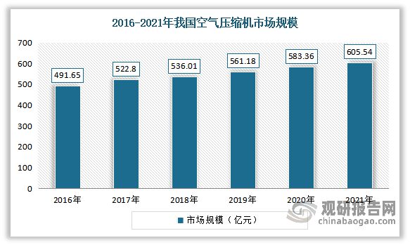 自2012年以來(lái),我國(guó)空氣壓縮機(jī)行業(yè)市場(chǎng)規(guī)模呈逐年上升態(tài)勢(shì)。從國(guó)內(nèi)空氣壓縮機(jī)行業(yè)銷(xiāo)售額來(lái)看,2020年我國(guó)空氣壓縮機(jī)市場(chǎng)規(guī)模從2016年的491.65億元增長(zhǎng)到了583.36億元??紤]到考慮到國(guó)內(nèi)節(jié)能環(huán)保相關(guān)政策日趨嚴(yán)格,行業(yè)節(jié)能改造需求將持續(xù)提升。估計(jì)2021年我國(guó)空氣壓縮機(jī)市場(chǎng)規(guī)??梢赃_(dá)到605.54億元。