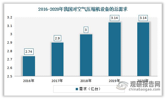 空氣壓縮機(jī)是現(xiàn)代工業(yè)的通用設(shè)備,廣泛應(yīng)用于機(jī)械制造、冶金、汽車(chē)、水泥、電力、電子、紡織等工業(yè)。進(jìn)入21世紀(jì)以來(lái),隨著我國(guó)經(jīng)濟(jì)進(jìn)入高速增長(zhǎng)期,工業(yè)水平的不斷提升,各行業(yè)商品貿(mào)易的日趨繁榮,對(duì)空氣壓縮機(jī)設(shè)備的總需求也在逐漸提升。2020年我國(guó)對(duì)空氣壓縮機(jī)設(shè)備的總需求在3.14億臺(tái)左右。