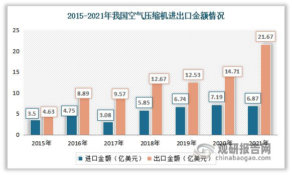一直以來(lái),我國(guó)空氣壓縮機(jī)進(jìn)出口市場(chǎng)保持著貿(mào)易順差。數(shù)據(jù)顯示,2021年我國(guó)空氣壓縮機(jī)行業(yè)進(jìn)出口總額為28.46億美元,其中出口額為21.67億美元,額為6.87億美元,實(shí)現(xiàn)貿(mào)易順差14.73億美元。