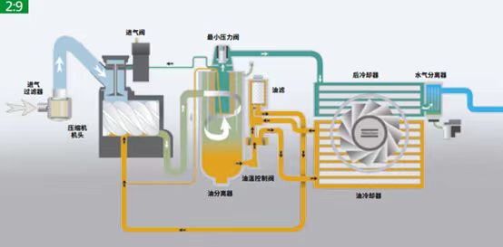 在液體式螺桿空壓機(jī)中,液體進(jìn)入壓縮室,也經(jīng)常會(huì)進(jìn)入空壓機(jī)軸承。其功能是冷卻并潤滑空壓機(jī)的運(yùn)動(dòng)部件、冷卻在內(nèi)部被壓縮的空氣,并減少返回進(jìn)氣道的泄漏。